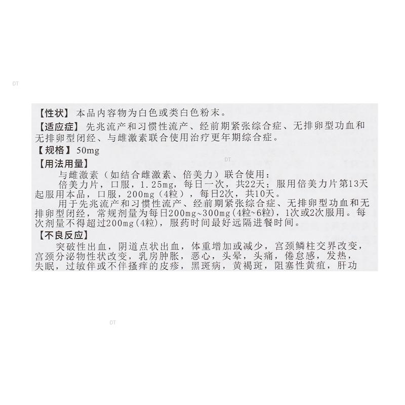 闭经:口服或阴道给药,100mg/次,早、晚(睡前2小时)各1次,每周期连续10天(一般在周期第17~26天)。
