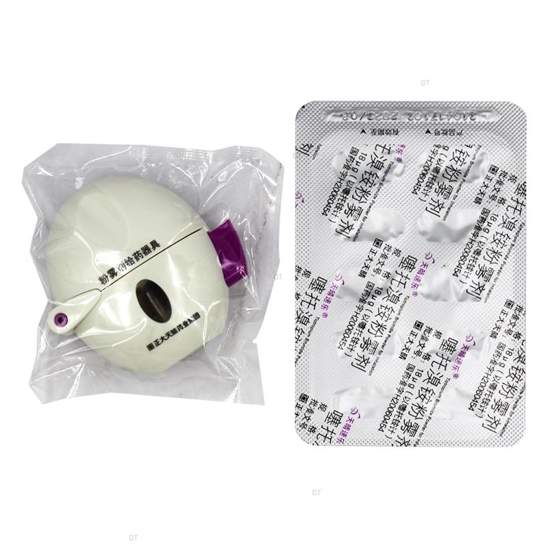 临用前,取胶囊1粒放入专用吸入器的刺孔槽内,用手指揿压按钮,胶囊两端分别被细针刺孔,然后将口吸器放入口腔深部,用力吸气,胶囊随着气流产生快速旋转,胶囊中的药粉即喷出囊壳,并随气流进入呼吸道。