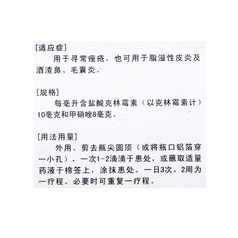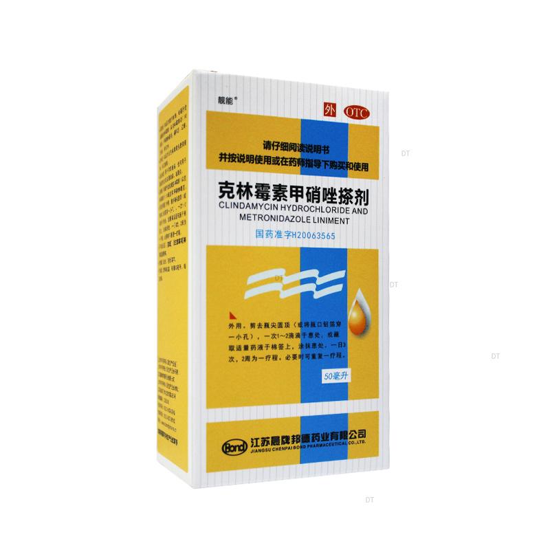 本品为复方制剂,每毫升含盐酸克林霉素(以克林霉素计)10毫克,甲硝唑8毫克。辅料为:乙醇、甘油、纯化水。