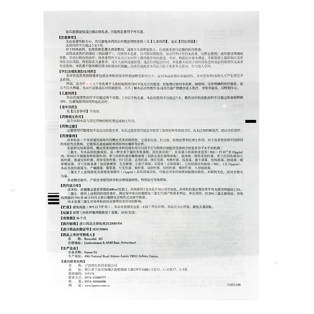 本品为复方制剂,其组分为1克乳膏含活性物质 :卤米松一水化合物 Halometasone monohydrate 0.5mg, 三氯生 Triclosan 10mg。赋形剂 :月桂基硫酸酯,丙烯甘油,加至1克。