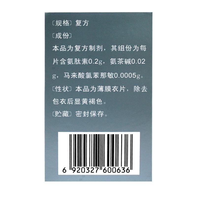本品为复方制剂,其组分为每片含氨肽素0.2g,氨茶碱0.02g,马来酸氯苯那敏0.0005g。