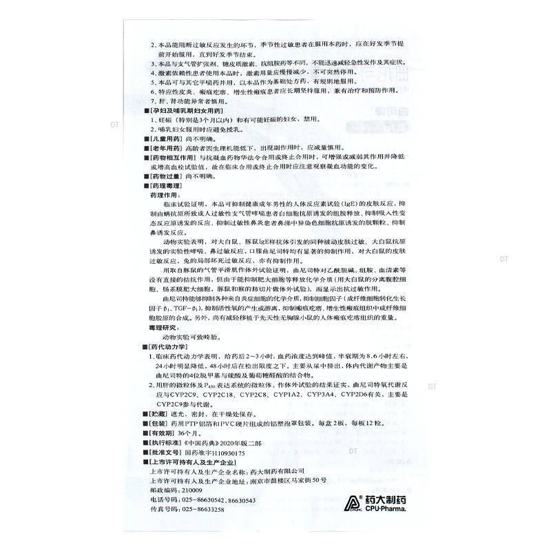 临床药代动力学表明,给药后2~3小时血药浓度达到峰值,半衰期为8.6小时左右,24小时明显降低,48小时后在检出限度之下。主要从尿中排出,体内代谢产物主要是曲尼司特的4位脱甲基与硫酸及葡萄糖醛酸的结合物。