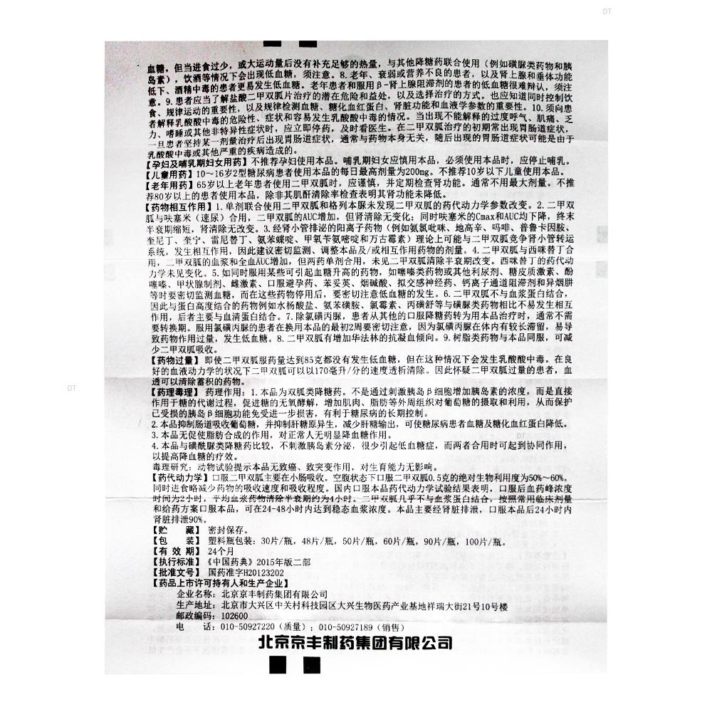 6.即往服用盐酸二甲双胍片治疗,血糖控制良好的2型糖尿病患者出现实验室化验异常或临床异常(特别是乏力或难于表达的不适),应当迅速寻找酮症酸中毒或乳酸酸中毒的证据,测定包括血清电解质、酮体、血糖、血酸碱度、乳酸盐、丙酮酸盐和二甲双胍水平,存在任何类型的酸中毒都应立即停用,开始其他恰当的治疗方法。