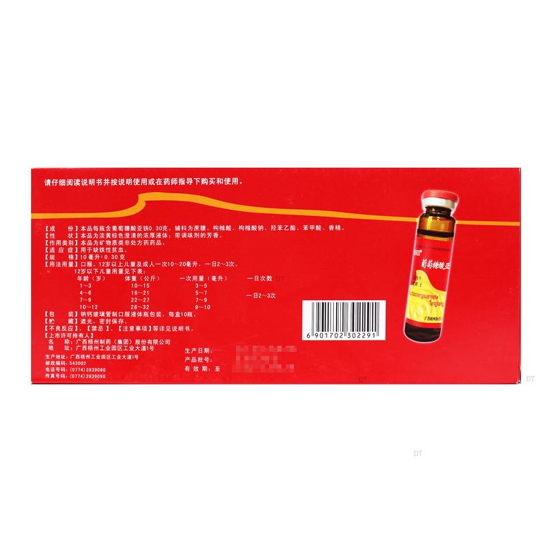 本品主要成份是葡萄糖酸亚铁。辅料为:蔗糖、柠檬酸、食用香精、蒸馏水、苯甲酸钠。