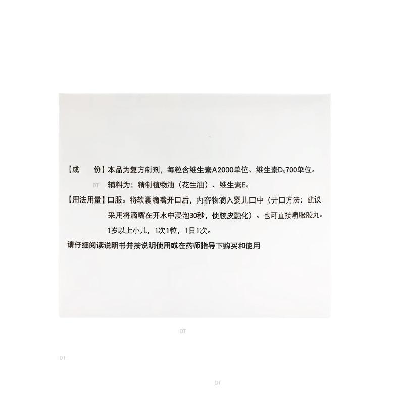 本品为复方制剂,每粒含维生素A2000单位、维生素D3700单位。辅料为:精制植物油、维生素E。