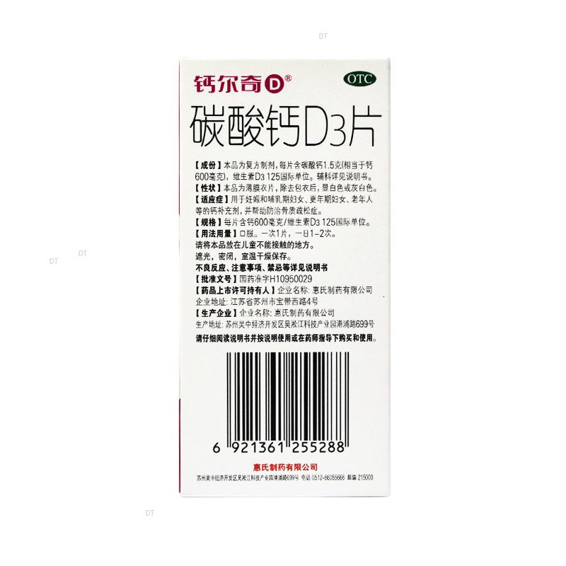 本品每片含主要成分碳酸钙1.5克(相当于钙600毫克),维生素D1.25毫克。