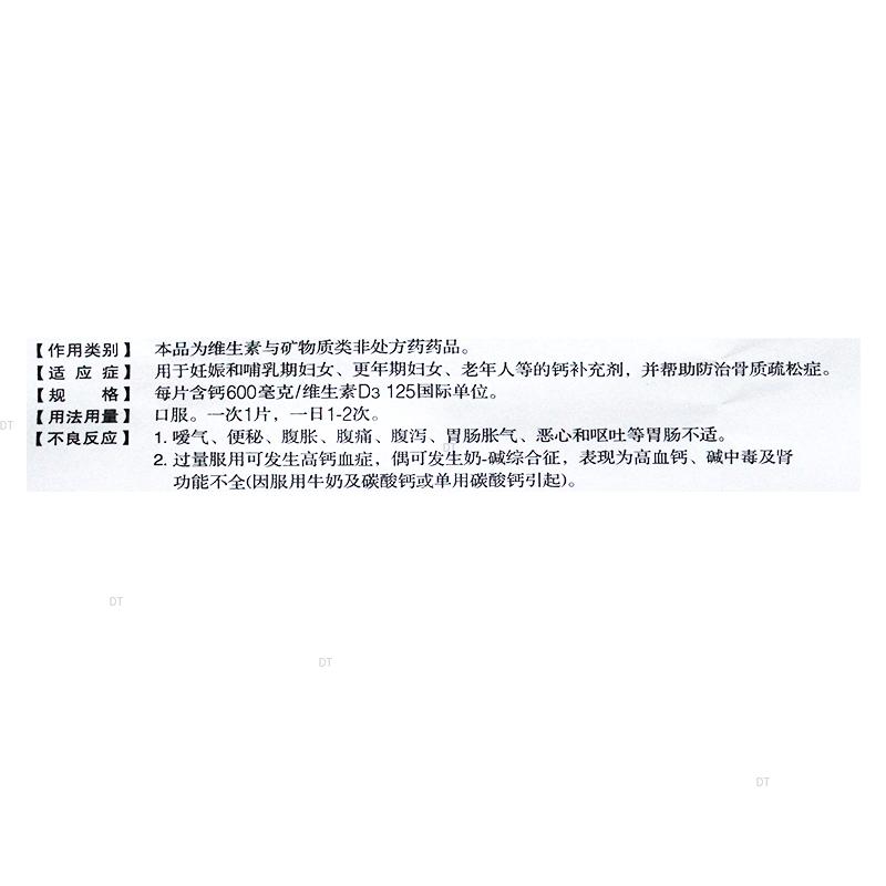 本品预防和治疗由于钙和维生素D缺乏所引起的疾病、如骨质疏松症、骨折、佝偻病、妊娠及哺乳期妇女缺钙。