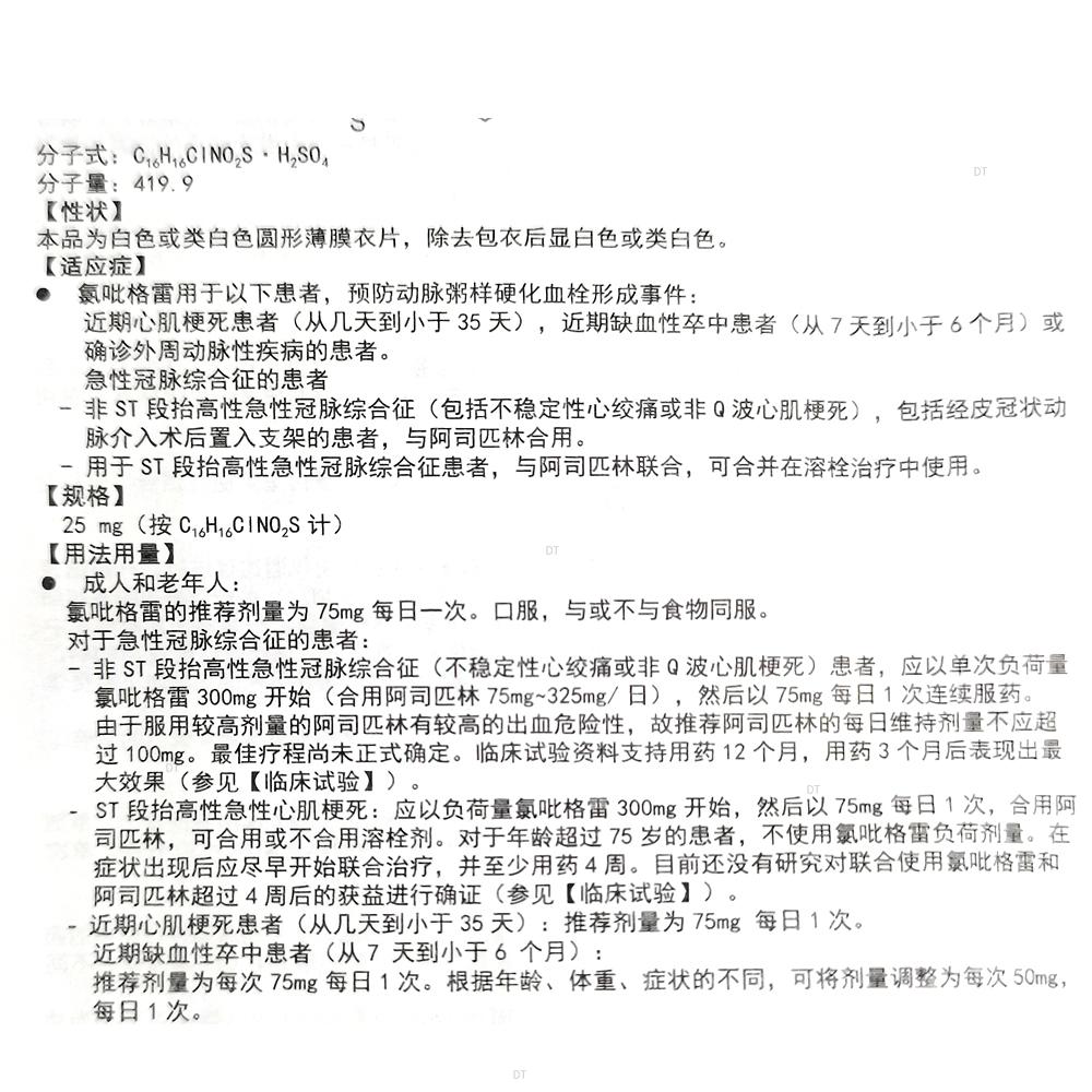 - ST段抬高性急性心肌梗死:应以单次负荷量氯吡格雷300mg开始,然后以75mg每日1次,合用阿司匹林,可合用或不合用溶栓剂。对于年龄超过75岁的患者,不使用氯吡格雷负荷剂量。在症状出现后应尽早开始联合治疗,并至少用药4周。目前还没有研究对联合使用氯吡格雷和阿司匹林超过4周后的获益进行确证。