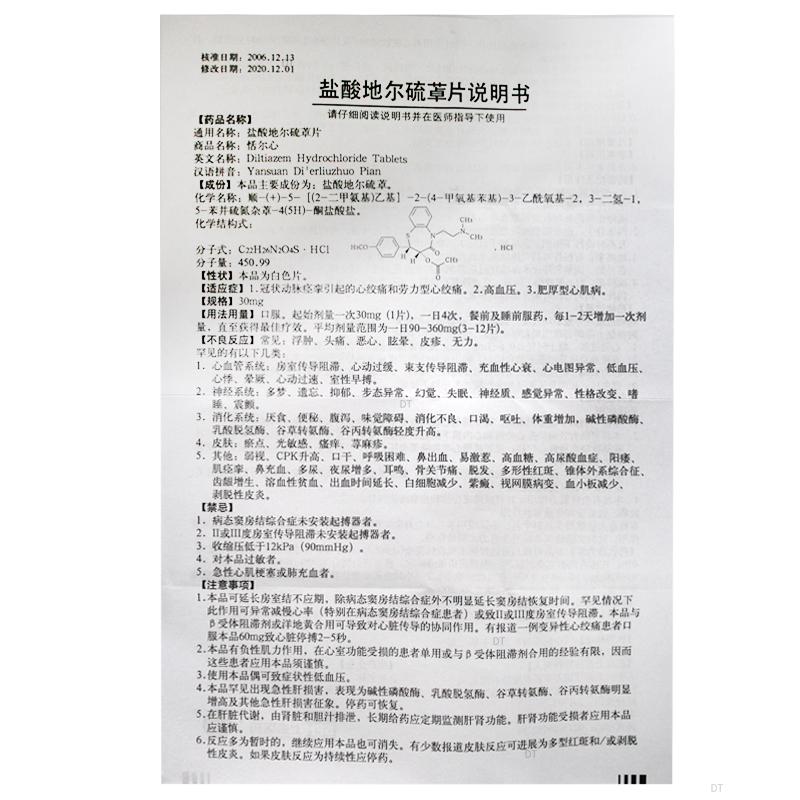 本品主要成份为:盐酸地尔硫卓。其化学名称为:顺-(+)-5-[(2-二甲氨基)乙基]-2-(4-甲氧基苯基)-3-乙酰氧基-2,3-二氢-1,5-苯并硫氮杂卓-4(5H)-酮盐酸盐。