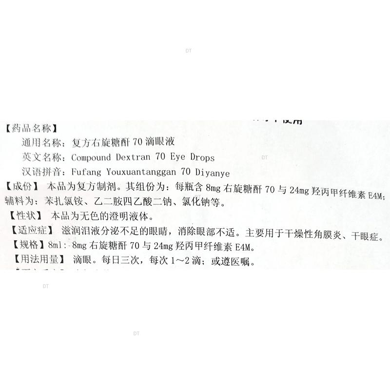 右旋糖酐70相对分子量与人血白蛋白相近,具有提高血浆胶体渗透压、增加血浆容量和维持血压的作用。可使聚集的血小板解聚,防止血栓形成。羟丙甲纤维素是纤维素的部分甲基和部分聚羟丙基醚,它可溶于冷水中形成具有一定粘性的溶液,其性质与泪液中的粘弹性物质(主要是粘蛋白)接近,因此,可以作为人工泪液来使用。本品模拟天然泪液。