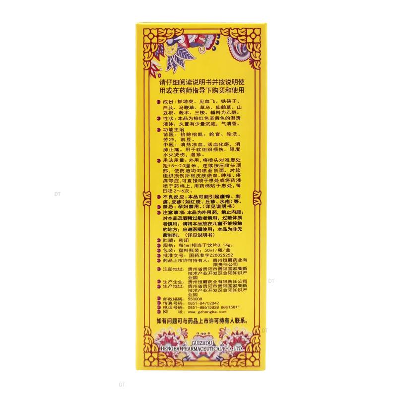 外用,将喷头对准患处距15~20厘米,连续按压喷头顶部,使药液均匀喷至患处。对软组织损伤所致皮肤瘀血、肿胀、疼痛等症,可直接喷于患处或将药液喷于药棉上,用药棉贴于患处,每日喷2~6次。对新鲜烧烫伤创面,连续喷药3-4次即可止痛,如有水泡,将其刺破,泡皮不须剥落。止痛后,每日用药2-6次(视其轻重,每日也可多喷数次)至痂皮脱落痊愈。