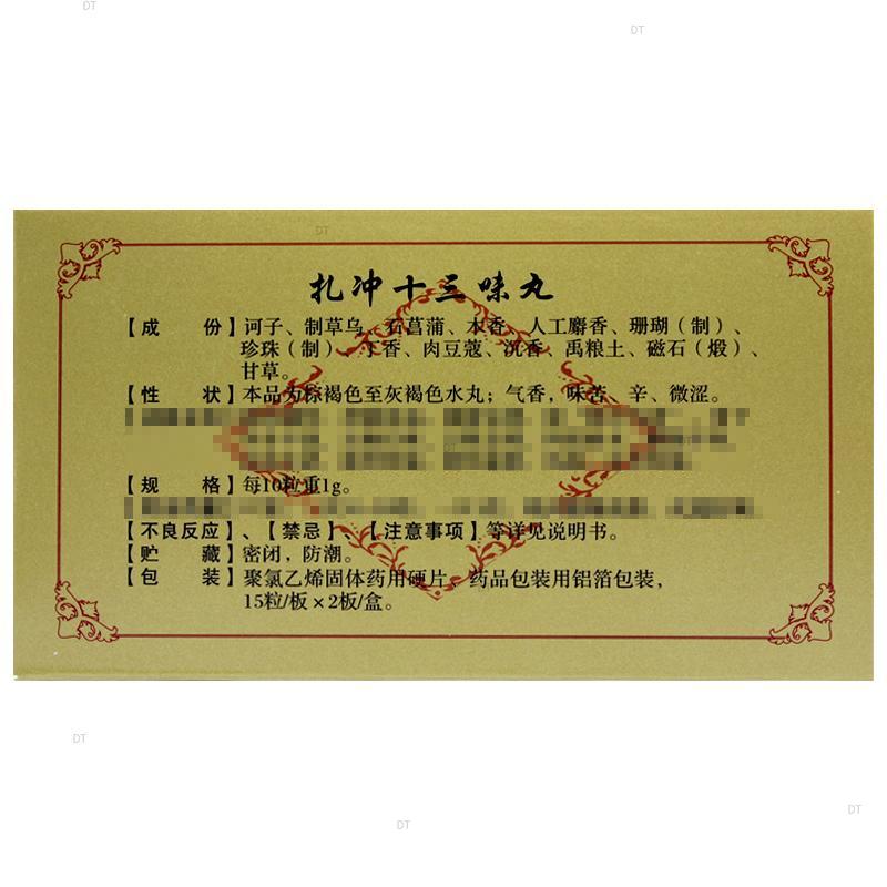 诃子、制草乌、石菖蒲、木香、人工麝香、珊瑚(制)、珍珠(制)、丁香、肉豆蔻、沉香、禹粮土、磁石(煅)、甘草。