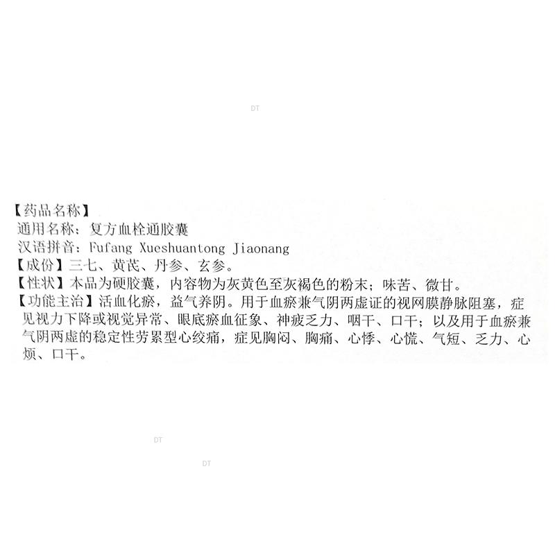 活血化瘀,益气养阴。用于血瘀兼气阴两虚证的视网膜静脉阻塞,症见视力下降或视觉异常、眼底瘀血征象、神疲乏力、咽干、口干;以及用于血瘀兼气阴两虚的稳定性劳累型心绞痛,症见胸闷、胸痛、心悸、心慌、气短、乏力、心烦、口干。
