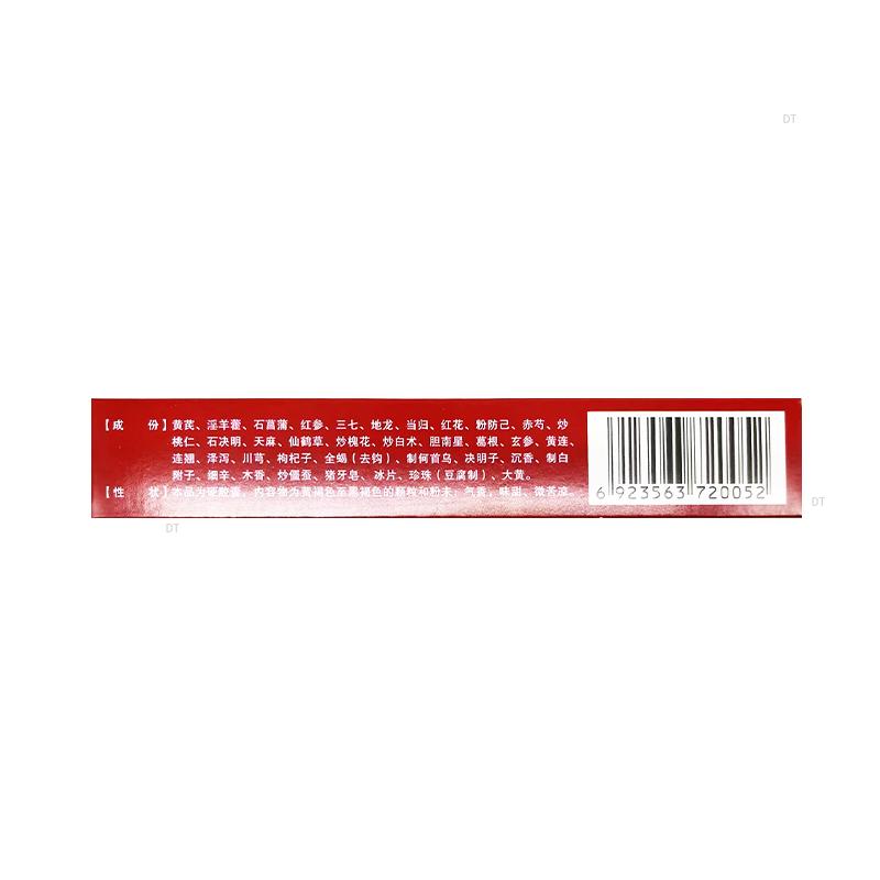 黄芪、淫羊藿、石菖蒲、红参、三七、地龙、当归、红花、粉防己、赤芍、桃仁(炒)、石决明、天麻、仙鹤草、槐花(炒)、白术(炒)、胆南星、葛根、玄参、黄连、连翘、泽泻、川芎、枸杞子、全蝎(去钩)、制何首乌、决明子、沉香、白附子(制)、细辛、木香、僵蚕(炒)、猪牙皂、冰片、珍珠(豆腐制)、大黄。