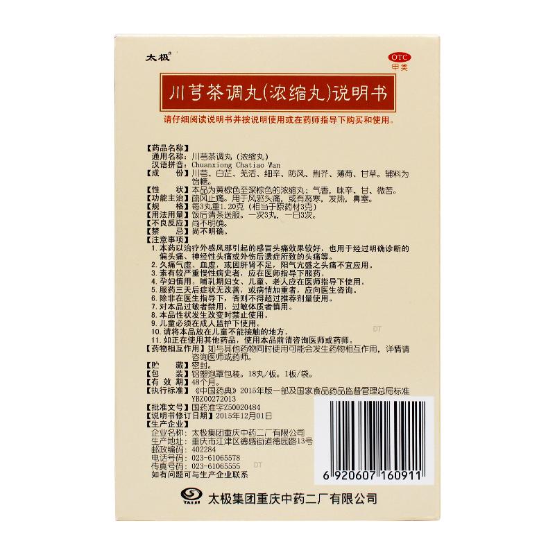 通用名称:川芎茶调丸(浓缩丸)(OTC)