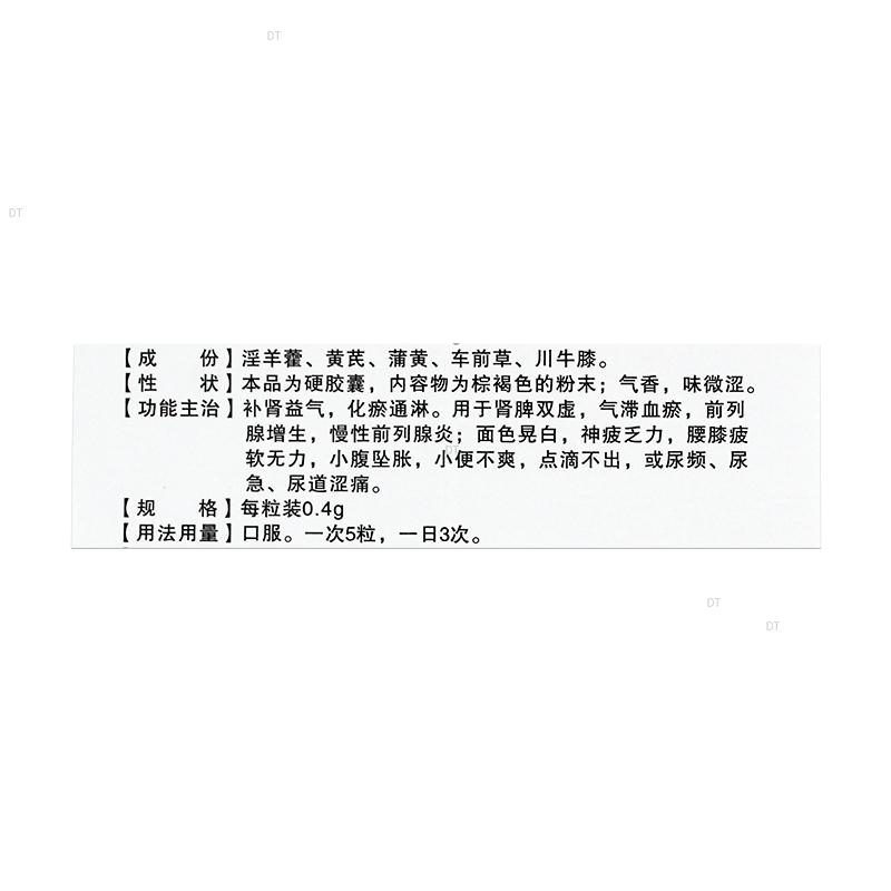 补肾益气,化瘀通淋。用于肾脾双虚,气滞血瘀,前列腺增生,慢性前列腺炎;面色晃白,神疲乏力,腰膝疲软无力,小腹坠胀,小便不爽,点滴不出,或尿频、尿急、尿道涩痛。