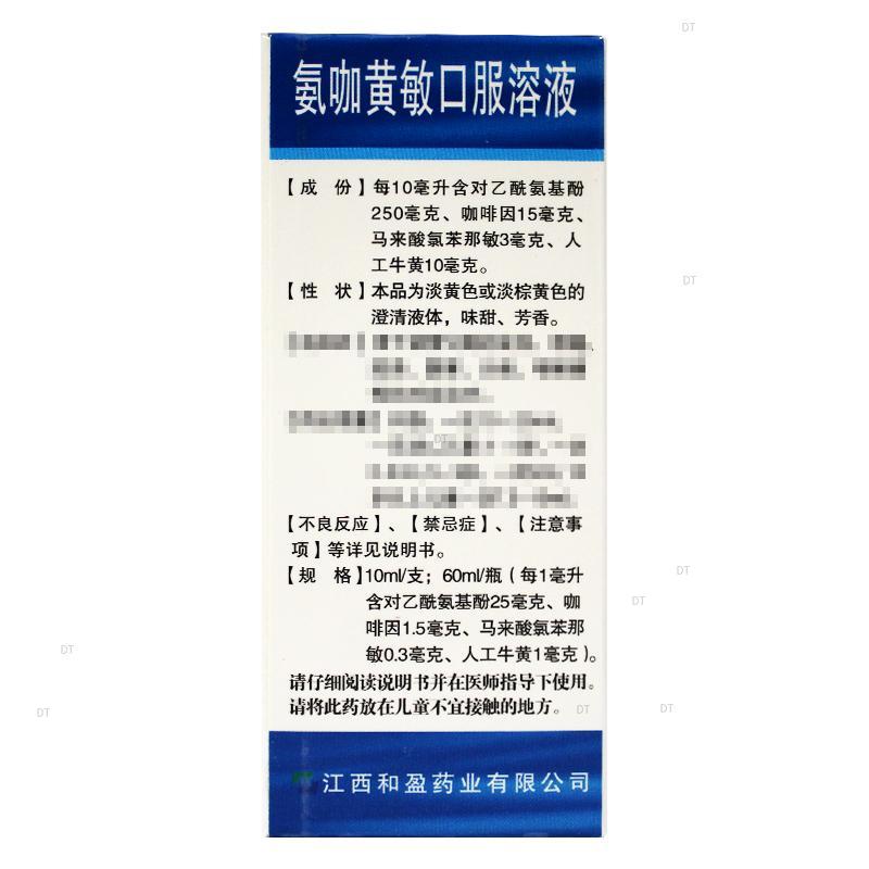 本品为复方制剂,每10毫升含对乙酰氨基酚125毫克、咖啡因7.5毫克、马来酸氯苯那敏1.5毫克、人工牛黄5毫克。