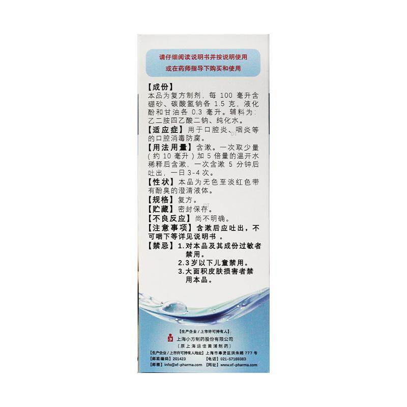 本品中硼砂与低浓度液化酚具有消毒防腐作用:甘油除对Q腔黏膜具有保护作用外,还能与磡砂、碳酸氢纳发生反应生成甘油硼酸钠,更有利于主药发挥药效。
