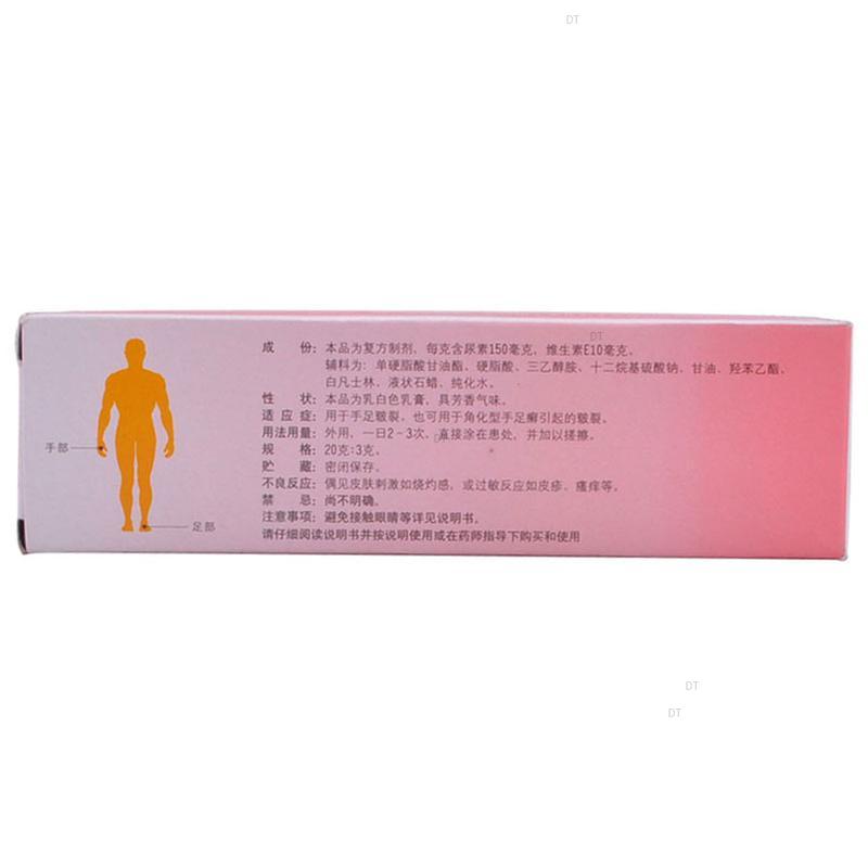 本品所含尿素能使皮肤角蛋白溶解变性,增进角质层水合作用,从而使皮肤柔软,防止干裂。维生素E是一种抗氧化剂,可以维持肌肉、神经正常发育与功能。