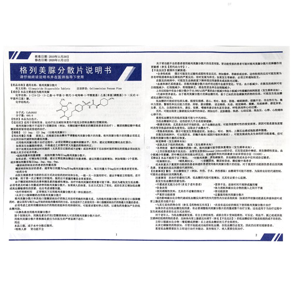 本品活性成分为格列美脲,属口服磺脲类降糖药。用于治疗非胰岛素依赖型糖尿病。格列美脲主要通过刺激胰岛β细胞释放胰岛素发挥作用。如其它磺脲类药物,格列美脲刺激胰岛β细胞释放胰岛素这一作用主要基于增加胰岛β细胞对生理浓度葡萄糖的反应性。此外,格列美脲也有明显的胰腺以外的作用,这一作用也存在于其它的磺脲类药物。胰岛素释放:磺脲类药物通过关闭胰岛β细胞膜ATP依赖性钾通道而调节胰岛素的分泌。关闭钾通道诱发β细胞膜去极化,同时开放钙通道导致钙离子向细胞内流入增加,通过胞吐作用刺激胰岛素的释放。格列美脲以高交换速率同ATP依赖性钾通道相关的β细胞膜蛋白结合,其结合部位不同于传统的磺脲类药物结合部位。胰腺外活性:胰腺外效应为改善外周组织对胰岛素的敏感性,并减少肝脏对胰岛素的摄取,外周肌肉和脂肪组织摄取血液中的葡萄糖,是通过位于细胞膜的特异性转运蛋白,葡萄糖在这些组织中的转移限制了葡萄糖的利用速率。格列美脲快速增加肌肉和脂肪细胞胞浆膜活性葡萄糖转移分子的数量,从而刺激葡萄糖的摄取。格列美脲增加糖基?磷脂酰肌醇?特异性磷脂酸C的活性,这与在孤立的脂肪和肌肉细胞中药物诱导的脂肪和糖原的合成有关。格列美脲通过增加细胞内2,6-二磷酸果糖的浓度,抑制肝脏葡萄糖的产生,由此抑制糖原的生成。一般药效学:健康个体的最小有效口服剂量约为0.6mg。格列美脲的效果是剂量依赖的和可重复的。在服用格列美脲的情况下,激烈运动时胰岛素的分泌减少这一生理反应仍然存在。无论餐前30分钟或者餐前即刻给药,其治疗效果均无显著差异,每日给药一次即可很好地控制糖尿病患者24小时的代谢。虽然格列美脲的羟基代谢产物引起健康受试者血清葡萄糖小幅度但具有统计学差异的降低,但这只是药物总体效果的一小部分。与胰岛素联合治疗:与胰岛素联合治疗的资料有限。当病人使用最大剂量的格列美脲仍不能有效地控制血糖时,可开始胰岛素的联合治疗。有两项研究证实,联合治疗可获得与胰岛素单独治疗相同的代谢控制;然而,联合治疗时需胰岛素的平均剂量更低。