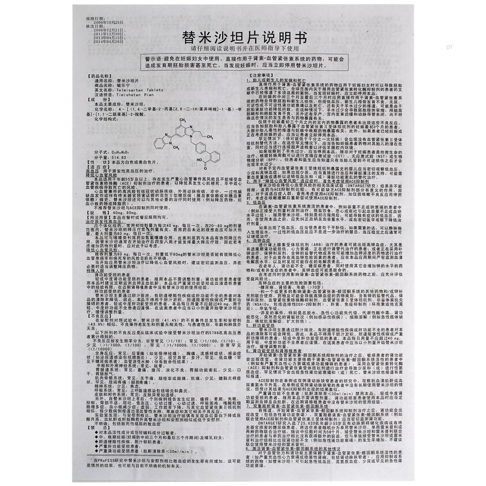 成人 推荐剂量40mg(1片),每日一次,口服。根据降压效果,遵医嘱在20mg~80mg间调整剂量。最大剂量80mg(2片),每日一次。本品可与噻嗪类利尿药如氢氯噻嗪合用,有协同降压作用。若欲加大药物剂量,必须考虑到替米沙坦发挥最大降压作用时间,通常在治疗开始后四至八周。