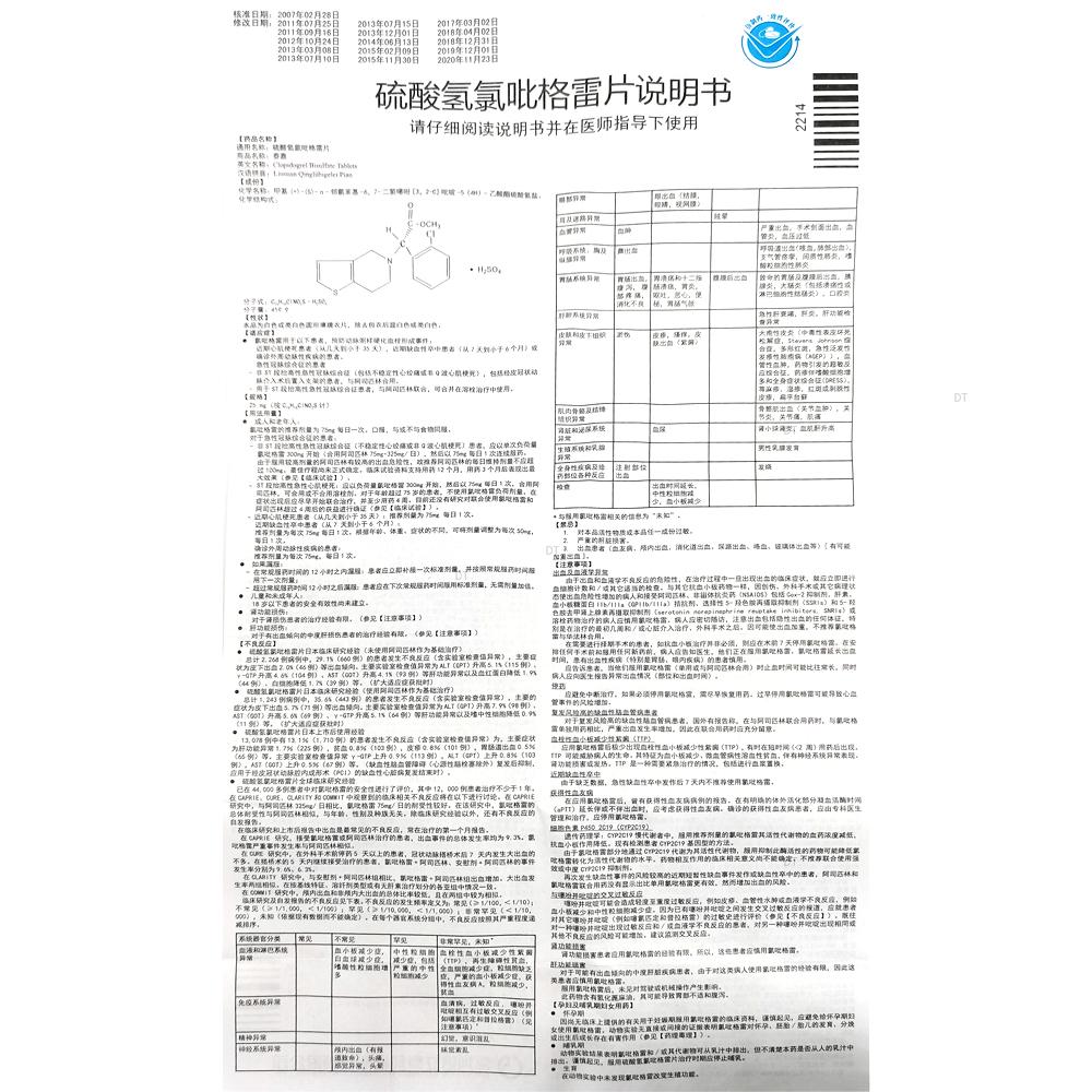 通用名称:硫酸氢氯吡格雷片