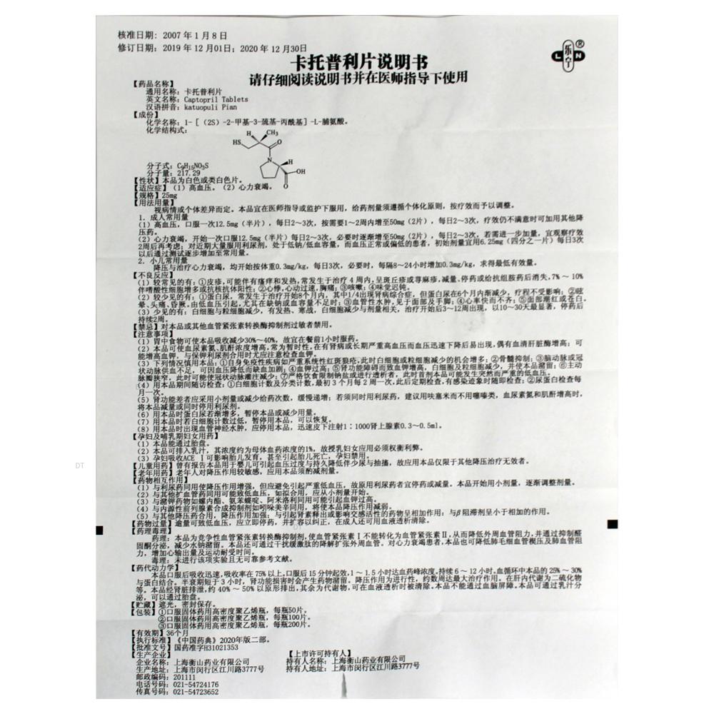 通用名称:卡托普利片