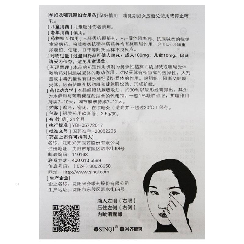 1.阿托品类扩瞳药对正常眼压无明显影响,但对眼压异常或窄角、浅前房眼患者,应用后可使眼压明显升高而有激发青光眼急性发作的危险。故对这类病例和40岁以上的病人不应用阿托品滴眼。2.本品应在医师知道下使用。3.用药时管嘴勿接触眼部,以防污染药品。4.当药品性状发生改变时禁止使用。5.滴眼后用手指压迫泪囊部1-2分钟,(见说明书下面图示)减少药液的全身吸收。6.本品系外用药品,严禁口服。7.开封后最多可使用四周。8.请妥为保存,放置儿童触摸不到的地方,避免儿童误食中毒。