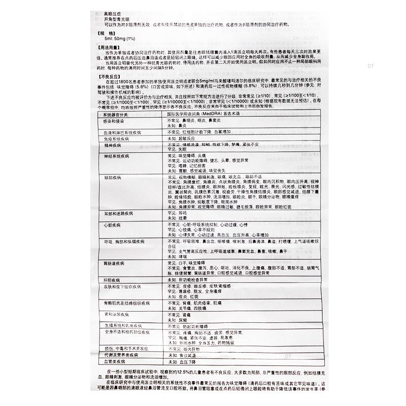 在超过1800名患者参加的单独使用派立明或者联合5mg/ml马来酸噻吗洛尔的临床研究中,最常见的与治疗相关的不良事件包括:味觉障碍(5.8%)(口苦或异味,如下所述)和滴药后一过性视物模糊(5.8%),可以持续几秒到几分钟(参见:对驾驶和操作机械的影响)。