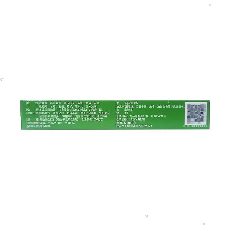 本品主要成份冬虫夏草、沙棘膏、蛤蚧、南五味子、百部、白及、百合、枇杷叶、甘草、牡蛎。