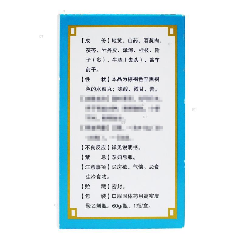 地黄、山药、山茱萸(酒炙)、茯苓、牡丹皮、泽泻、桂枝、附子(制)、牛膝(去头)、车前子(盐炙)。辅料为蜂蜜。