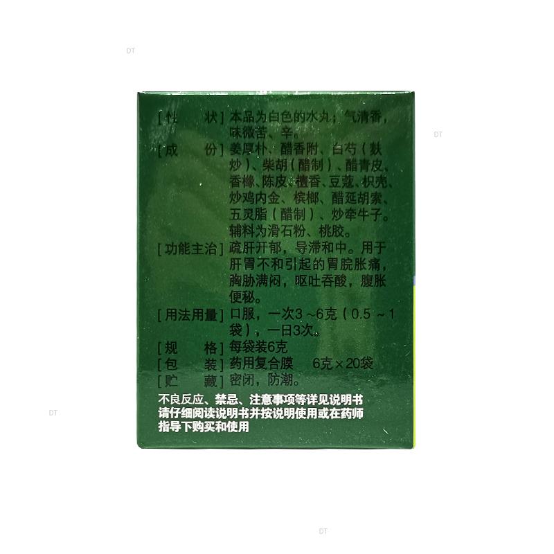 本品成分为柴胡(醋制)、香附(醋制)、香橼、槟榔、牵牛子(炒)、 青皮(醋炒)、陈皮、枳壳、厚朴(姜制)、檀香、豆蔻、延胡索(醋炒)、白芍(麸炒)、鸡内金(炒)、五灵脂(醋制)。辅料为滑石粉、桃胶。