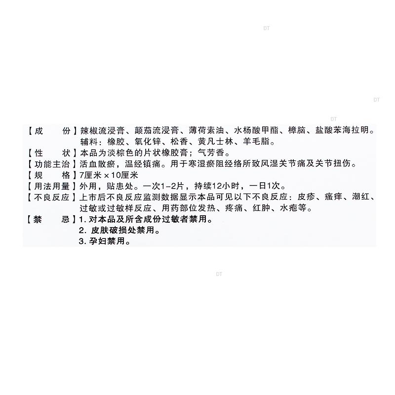 2. 本品含有刺激性药物,忌贴于创伤处,有皮肤病者慎用,皮肤过敏者停用。