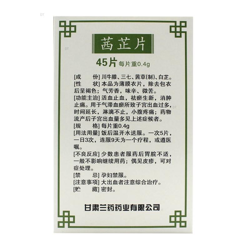 活血止血,祛瘀生新,消肿止痛。用于气滞血瘀所致子宫出血过多,时间延长,淋漓不止,小腹疼痛;药物流产后子宫出血量多见上述症候者。