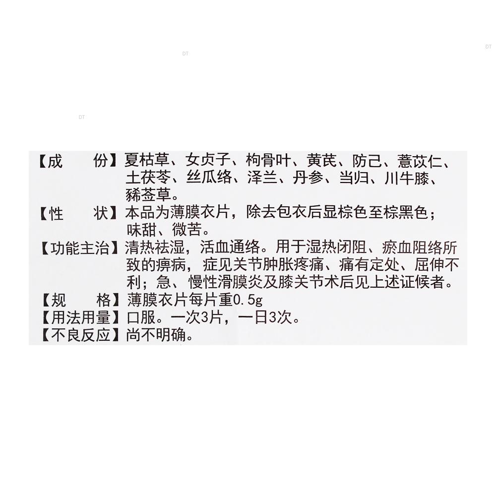 本品清热利湿,活血通络。用于急、慢性滑膜炎及膝关节术后的患者。