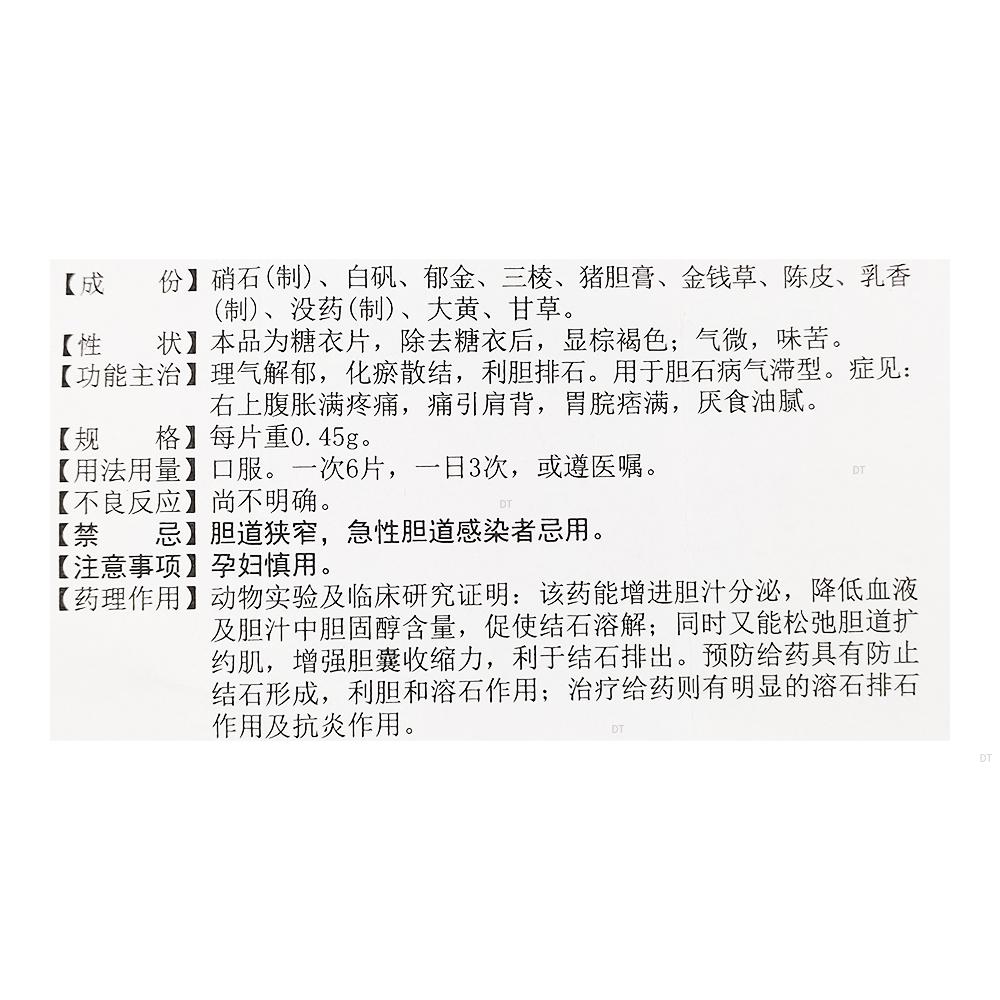 理气解郁,化瘀散结,利胆排石。本品用于胆石病气滞型。症见:右上腹胀满疼痛,痛引肩背,胃脘痞满,厌食油腻。