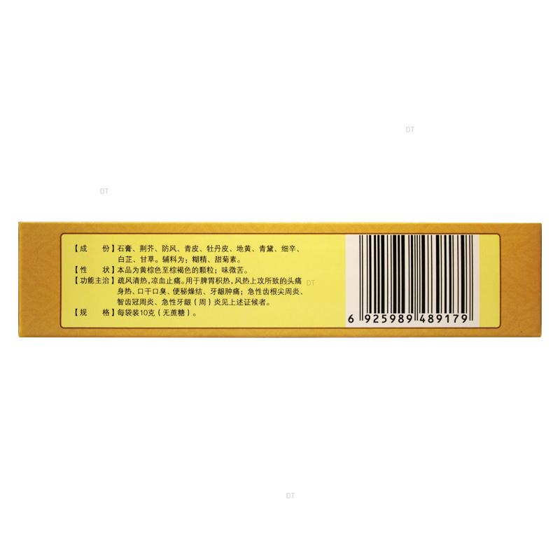 疏风清热,凉血止痛。本品用于脾胃积热、风热上攻所致的头痛身热、口干口臭、便秘燥结、牙龈肿痛;急性齿根尖周炎、智齿冠周炎、急性牙龈(周)炎见上述证候者。