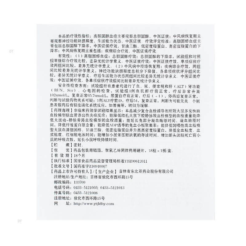本品活血化瘀,温经通络。用于瘀血阻络所致的中风,症见神情呆滞、言语謇涩、手足发凉、肢体疼痛;缺血性中风及高脂血症见上述证候者。