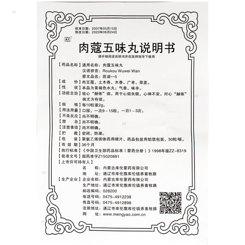 通用名称:肉蔻五味丸