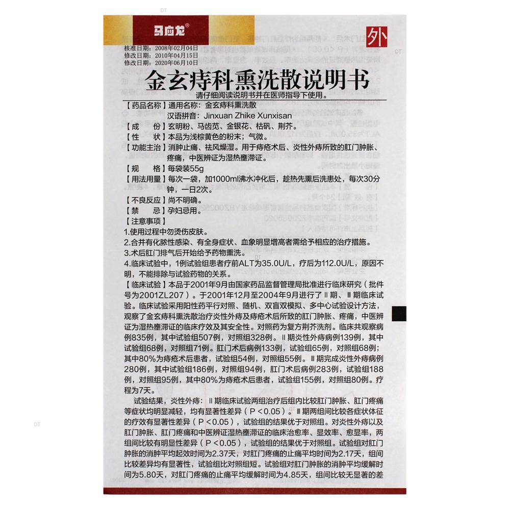 本品于2001年9月由国家药品监督管理局批准进行临床研究(批件号为2001ZL207)。于2001年12月至2004年9月进行了Ⅱ期、Ⅲ期临床试验。临床试验采用阳性药平行对照、随机、双盲双模拟、多中心实验设计方法,观察了金玄痔科熏洗散治疗炎性外痔及痔疮术后所致的肛门肿胀、疼痛,中医辨证为湿热壅滞证的临床疗效及其安全性。对照药为复方荆芥洗剂,临床共观察病例835例,其中试验组507例,对照组328例。Ⅱ期炎性外痔病例139例,其中试验组68例,对照组71例。肛门术后病例133,例,试验组65例,对照组68例;其中80%为痔疮术后患者,试验组54例,对照组55例。Ⅲ期完成炎性外痔病例280例,其中试验组186例,对照组94例,肛门术后病例283例,试验组188例,对照组95例,其中80%为痔疮术后患者,试验组155,对照组 80例。疗程为7天。