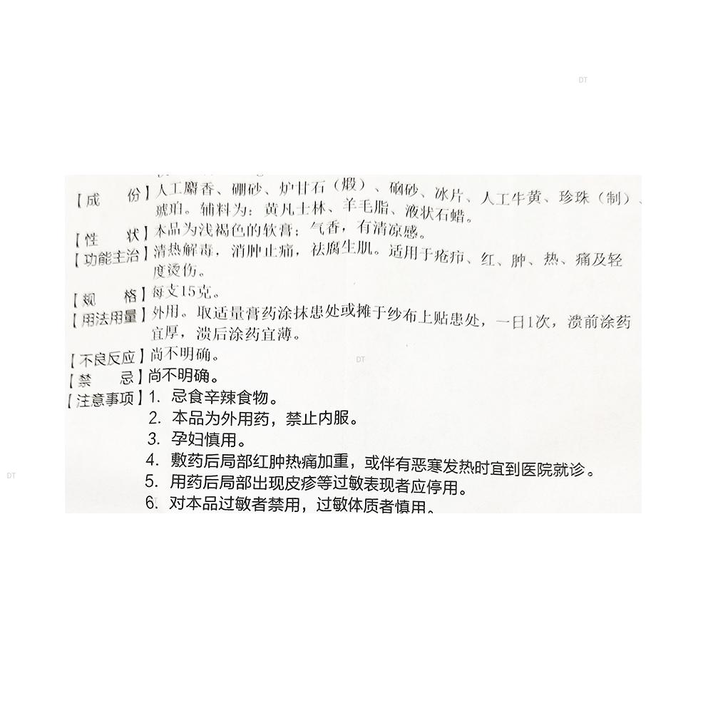 人工麝香、硼砂、炉甘石(煅)、硇砂、冰片、人工牛黄、珍珠(制)、琥珀。辅料为:黄凡士林、羊毛脂、液状石蜡。