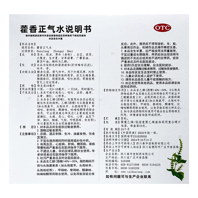 本品苍术、陈皮、厚朴(姜制)、白芷、茯苓、大腹皮、生半夏、甘草浸膏、广藿香油、紫苏叶油。