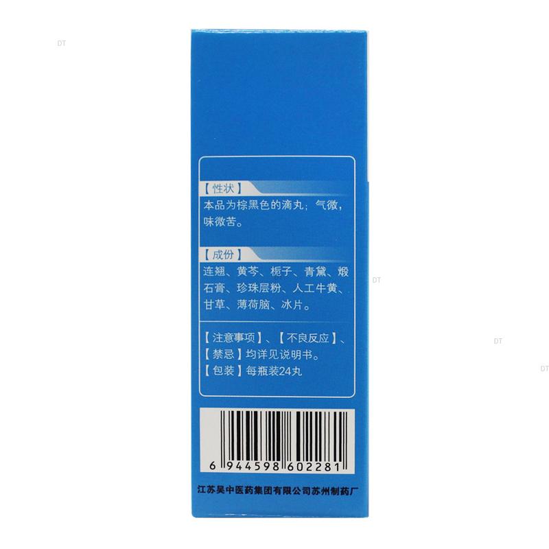 连翘、黄芩、栀子、青黛、煅石膏、人工牛黄、甘草、薄荷脑、冰片、珍珠层粉。