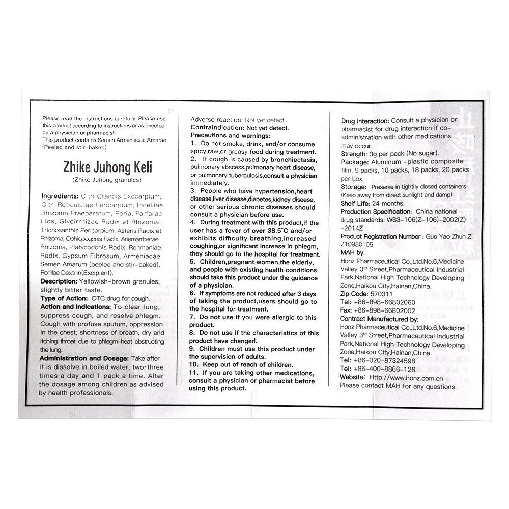 化橘红、陈皮、法半夏、茯苓、款冬花、甘草、瓜蒌皮、紫菀、麦冬、知母、桔梗、地黄、石膏、苦杏仁(去皮渗)、 紫苏子(炒)。铺料为糊精。